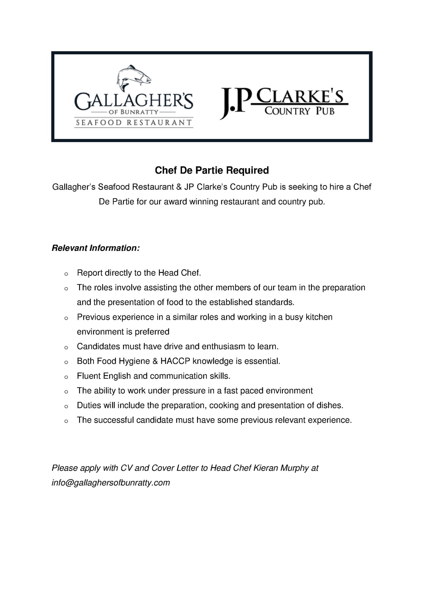 Gallagher S Clarke S Of Bunratty On Twitter We Re Hiring Chef De Partie Required For Gallagher S Seafood Restaurant Jp Clarke S Country Pub Clarejobsupport Limkjobfairy Https T Co Ocsxumaljd