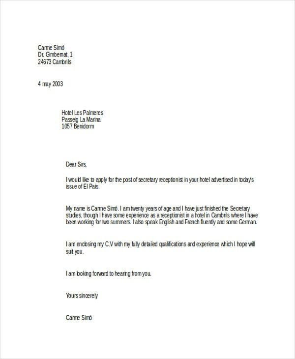 Dear sirmadam i sent this letter for applying for the post of receptionist in your hotel. Job application letter format. Sample job application for receptionist or job application for telephone operator an easy written format to be used by people who want to apply for the post of receptionist in any organizationapplication or cover letter should be simply written describing the skills you do have. If you want to apply as a receptionist in a particular industry or company we can give you samples of receptionist job application letter templates which you may use in creating your own job application lettermore so we have other samples and templates of application letter if you want to use an application letter for another.