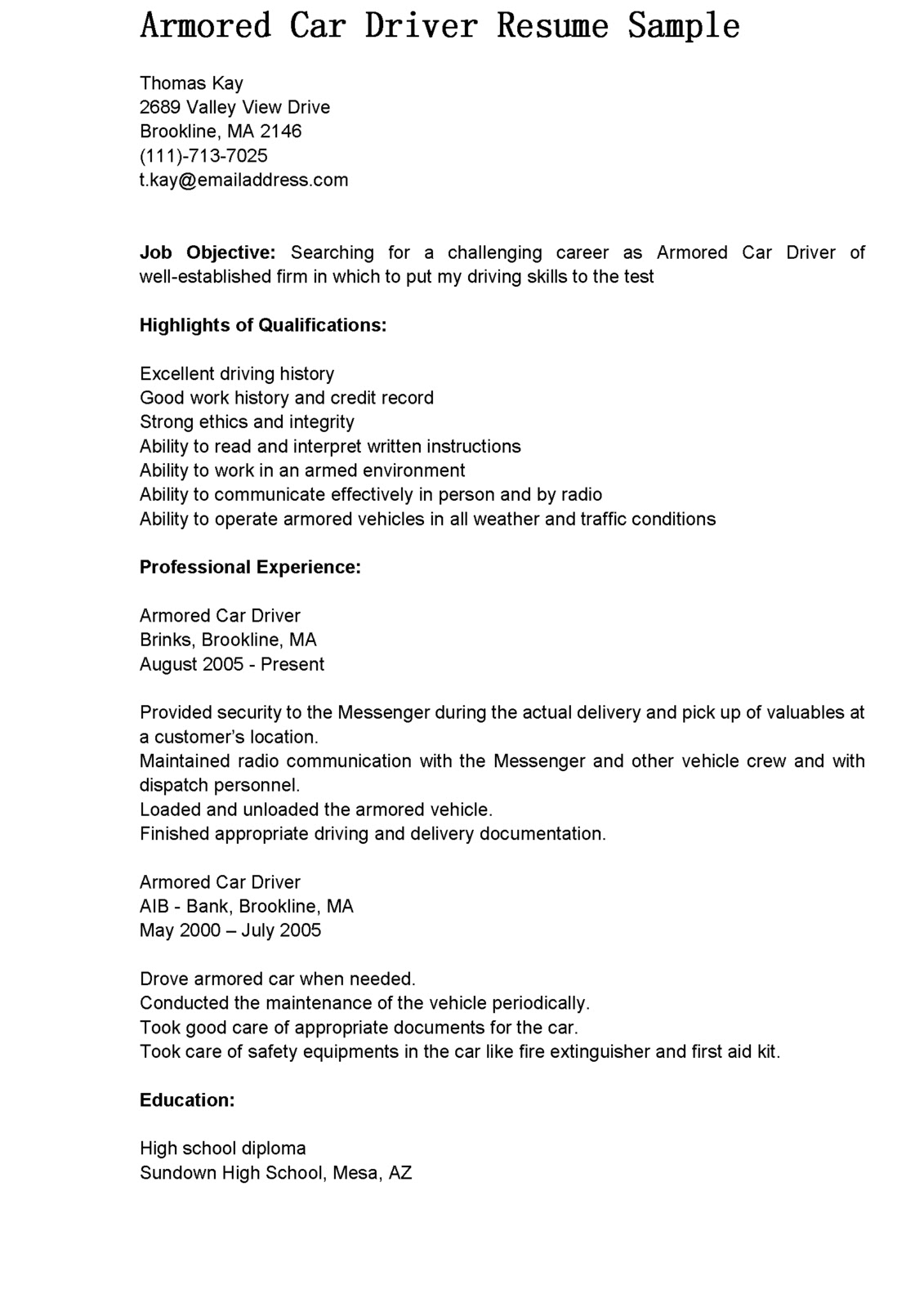 Driver Sample Resume