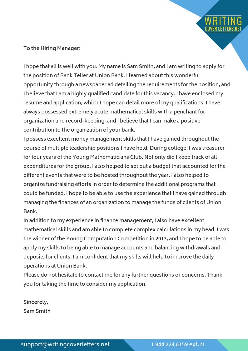 Convince the hiring manager with this sample bank teller cover letter. Job seekers understand the importance of a cover letter but most of the time they struggle in achieving good writing goals. Though im an entry level applicant im passionate about doing a good job and i a few achievements that fit skills they want. Bank teller cover letter with no experience.