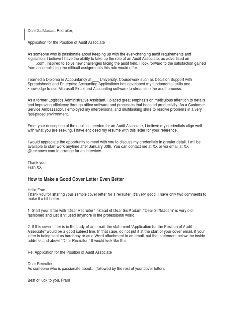 When youre applying for a job as a recruiter its especially important to show that you understand the hiring processthis means creating a resume and cover letter that showcase your previous recruiting experience and the successes youve had helping companies grow their applicant pool and staff. A cover letter to a recruiter provides some more general information about you as a marketable candidate for multiple clients. As an experienced recruiter i understand the importance of writing a strong cover letter which is why im not going to waste time with fluff and filler. A cover letter to a recruiter or potential employer is going to focus on a specific position and why youd be a good fit for it.