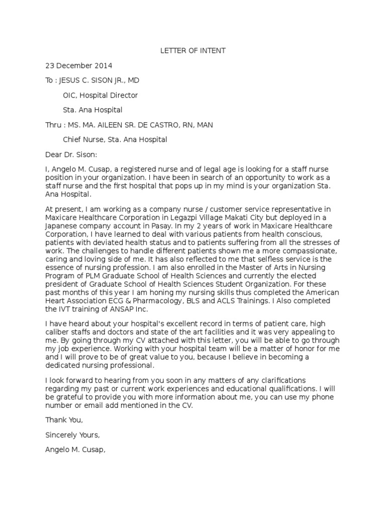 368 sample of letter of intent for job application for nurses. The nurse practitioner is a professional nurse that works individually. Letter of intent format. 16 sample job application letters for nurses the nursing career varies significantly throughout the world. Leave a single line space and mention the current date when you write the letter.